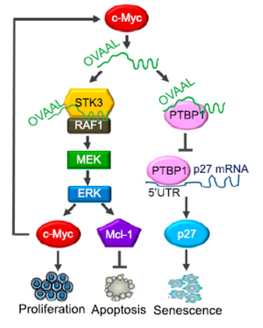 TRAIL和 Mcl-1 抑制剂 UMI-77分别通过外源和内源途径诱导细胞凋亡,癌症发生过程中往往伴随凋亡通路的部分失活,分别分析可耐受两种药物处理条件的细胞中表达变化的分子有助于找到对该途径有作用的功能分子。作者首先从两种凋亡诱导条件耐受的细胞中测序分析了表达谱的变化,两种细胞中共同上调的非编码RNA分子有37种,其中OVAAL (ovarian adenocarcinoma-amplified lncRNA)发现在多种肿瘤细胞抗凋亡机制中发挥作用。机制分析表明OVAAL可以一方面通过结合STK3,促进下游RAF级联通路,最终促进c-Myc和Mcl-1表达,促进增殖并抑制凋亡。另一方面,OVAAL还可以通过结合PTBP1,竞争性释放p27 mRNA,进而促进p27的蛋白表达,抑制细胞衰老。(参考文献[3])