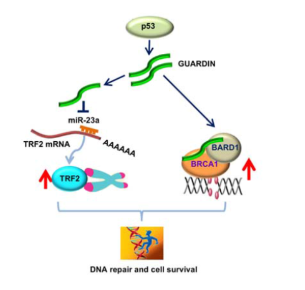 文章作者发现GUARDIN通过两种途径参与基因组稳定性的维持,(1)竞争性结合miR-23a,促进TRF2的稳定性,进而维持端粒的稳定性。(2)GUARDIN作为支架分子,促进BRCA1与BARD1的结合,维持DNA的修复功能。干扰GUARDIN可诱发细胞凋亡或衰老。(参考文献[5])