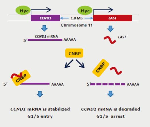 LAST是一种受c-Myc转录激活非编码RNA(LncRNA-Assisted Stabilization of Transcript),LAST可促进细胞周期进程,促进CCND1的mRNA稳定性。RNA Pull-down实验发现了LAST与CNBP的相互作用。体内,LAST具有促癌作用。(参考文献[9])