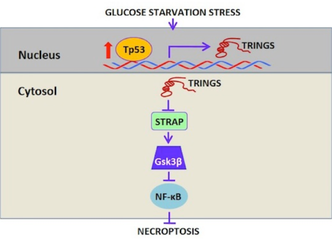 TRINGS 是一种受p53调控的非编码RNA,在葡萄糖缺失的状态下,TRINGS 表达激活,与STRAP结合,释放GSK3β,促进GSK3β的Ser-9磷酸化,进而稳定NF-КB通路,促进细胞存活。(参考文献[10])