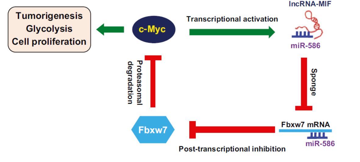2016年6月17日,EMBO Reports杂志发表了中国科技大学吴缅教授为通讯作者的文章,报道一种受c-Myc调控的非编码RNA MIF可作为内源竞争性RNA分子(ceRNA)结合miR-586,促进FBXW7表达。(参考文献[15])