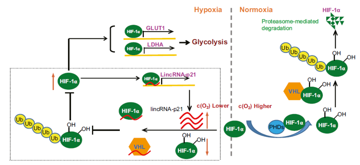 lincRNA-p21可以在低氧条件下诱导表达,也可以通过HIF1α调控表达。lincRNA-p21可以结合HIF1α或VHL,阻止VHL与HIF1α的直接结合,保护HIF1α不受VHL的降解。HIF1α又反过来诱导lincRNA-p21的表达, 形成了一种正反馈的通路。(参考文献[22])