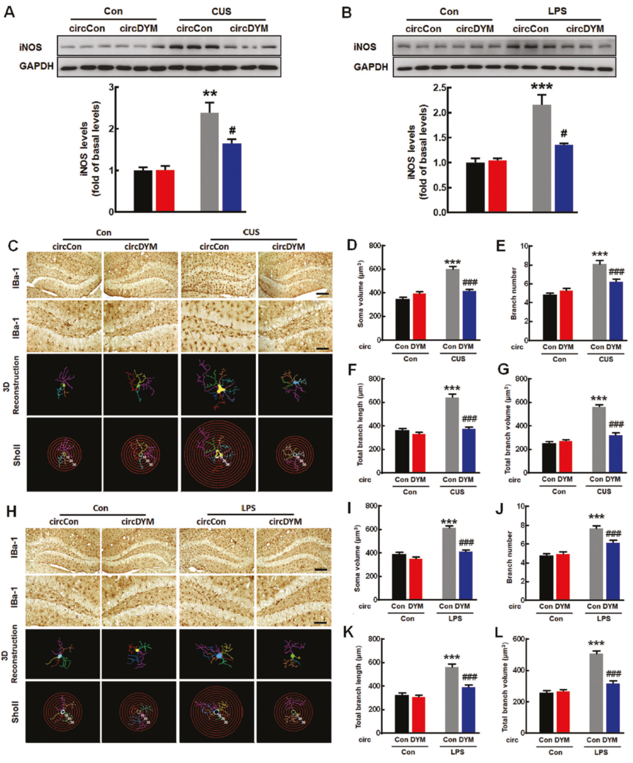 重度抑郁症(MDD),也简称为抑郁症,是一种精神障碍,其特征在于在大多数情况下存在至少两周的低情绪,通常伴随着低自尊,对正常愉快的活动失去兴趣,低能量和没有明确原因的疼痛。发病原因认为是遗传,环境和心理因素的综合。之前的研究报道发现,慢性不可预测应激(CUS)诱导的抑郁症小鼠模型中前额皮质的miR-9表达水平上调,而由DYM的4,5,6号外显子组成的circDYM作为 miR-9的sponge。作者之前的研究工作也发现了敲低miR-9表达可以抑制LPS诱导的海马回小胶质细胞的活化。小胶质细胞在免疫监视中发挥着重要的作用,也参与不同神经病理发生发展的过程。小胶质细胞活化后释放的炎症因子介导应激效应,从而容易导致人和小鼠模型的抑郁发生。(参考文献[3])