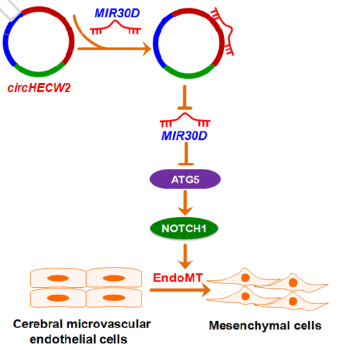 2018年12月20日,国际著名杂志Autophagy在线发表了东南大学医学院姚红红教授的研究成果,报道发现circHECW2通过竞争性结合miR-30d,促进ATG5表达,ATG5以非自噬的作用途径影响EMT过程,参与血脑屏障完整性的调控。