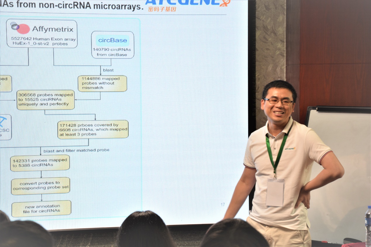 密码子基因科技的首席科学家丁向明博士首先做了“circRNA数据挖掘趋势及最新动态”报告,紧扣前沿技术,深入浅出,带领学员快速开启了全新思维,大家反响热烈并积极提问。