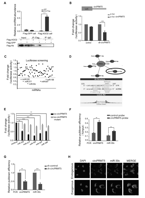 为进一步明确具体是哪种miRNA结合了circPRMT5,通过biotin标记的 circPRMT5 进行RIP实验, RT-qPCR检测复合物中的miRNA,发现了只有miR-30c有明显富集情况(F);如果敲低了circPRMT5表达后,RIP复合物中富集的miR-30c明显减少(G);RNA-FISH实验证明了内源性或者外源性circPRMT5与miR-30c的共定位(H)。