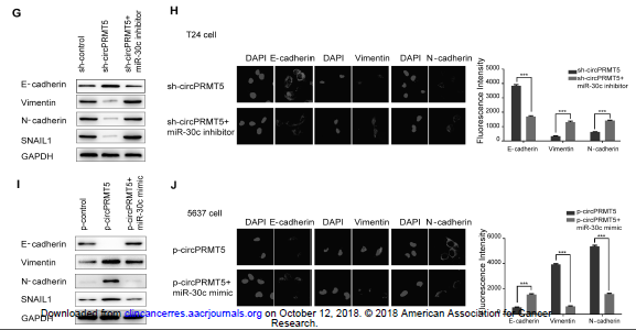 ③作者假设circPRMT5结合miR-30c,促进miR-30c下游靶向基因的表达,通过miRanda数据库分析,miR-30c可直接结合EMT进程相关的转录因子SNAIL1的3’ UTR区域,转染miR-30c可以明显抑制UCB细胞的SNAIL1表达。另外在UCB细胞中敲低circPRMT5表达后,WB和FISH检测发现E-cadherin表达水平明显增加,而Vimentin 和N-cadherin表达水平明显下调,而同时给予miR-30c抑制剂,会出现相反的WB和FISH结果(G,H);过表达circPRMT5会下调E-cadherin的表达,上调Vimentin 和N-cadherin表达,如果给予miR-30c模拟物,会出现相反的WB和FISH结果(I,J)。