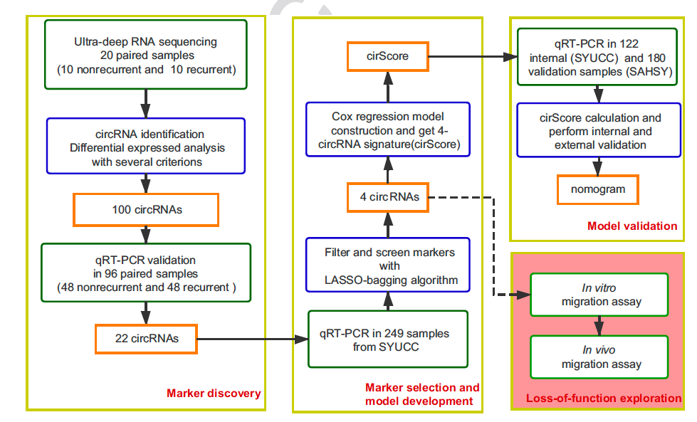 9月2日,EMBO Mol Med(IF=10.62)在线发表一篇circRNA的临床转化文章,来自中山大学附属肿瘤医院的研究团队采用高通量测序数据系统的鉴定和筛选了一批可用于中期结肠癌复发预测的circRNA,并在第三方数据中得到验证。中山大学附属肿瘤医院的徐瑞华教授为该文章通讯作者,鞠怀强副研究员,赵齐博士、王峰副主任医师、王梓贤博士及中山大学附属第六医院的兰平教授为文章共同第一作者。该研究在国家自然科学基金及广东省自然科学基金等项目资助下完成【1】。