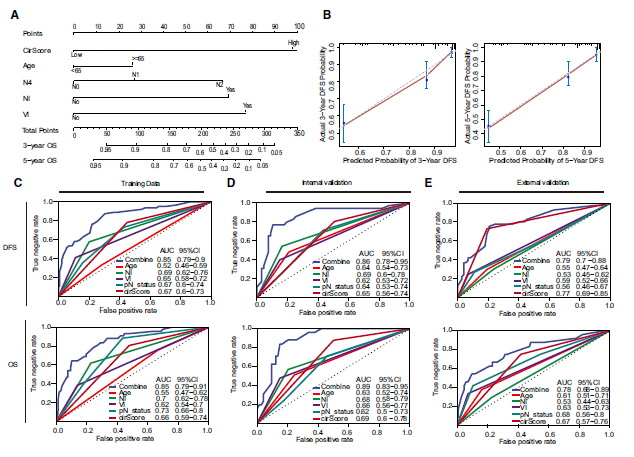 目前,临床上可以用于预测复发风险的临床因素有分化程度、神经浸润、淋巴结或血管浸润以及是否T4分期等。为了与已有风险因素进行比较,作者基于临床风险因素将所有患者进行分层,分为二期高危/低危以及三期高危/低危四个组,分别比较组内cirScore的预测能力。结果显示,分层分析下cirScore也可以将组内高复发风险和低复发风险的患者作出进一步的划分。此外对于病患中总生存的预测亦是如此。为了进一步的分析,作者还将这些信息作为协变量进行怼因素Cox回归分析,证明了cirScore是可以作为独立的预测因素。为此,作者cirScore加入到现有的临床因素当中,旨在希望能对病人做更准确的划分。构建了可以用于直观预测的nomogram,并且在验证数据集中得到验证。结果表明,整合了cirScore的多变量回归Cox模型可以大幅度提高现有预测中期肠癌复发和生存的准确性。