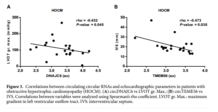 为探索HCM中circRNA与不同超声心动图参数的潜在关联,研究者还进行了相关分析。如图3所示,在该患者组中,circRNA circDNAJC6和circTMEM56与左心室流出道梯度(LVOT gr.max)和室间隔(IVS)厚度之间存在直接的显著相关性。在整个HCM人群或HNCM亚组中,circRNA和超声心动图参数之间未发现相关性(数据未显示)。综上所述,HOCM患者中circRNA的表达水平与LVOT梯度和IVS厚度呈负相关,这将有助于改善对这种阻塞性心脏病的严重程度认识和早期发现。