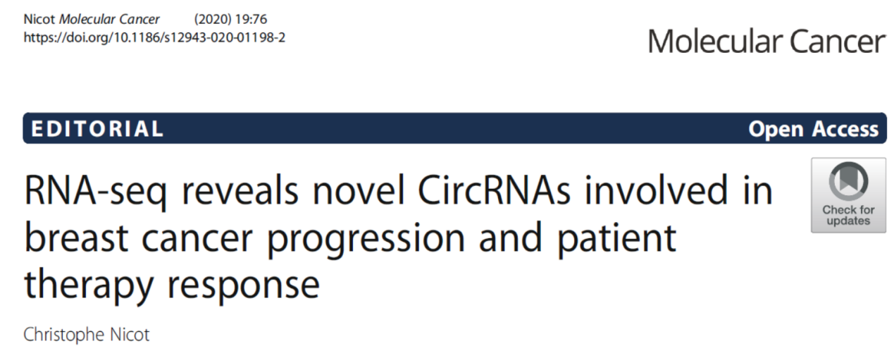 1. Christophe Nicot. RNA-seq reveals novel CircRNAs involved in breast cancer progression and patient therapy response. Molecular Cancer, 2020.
