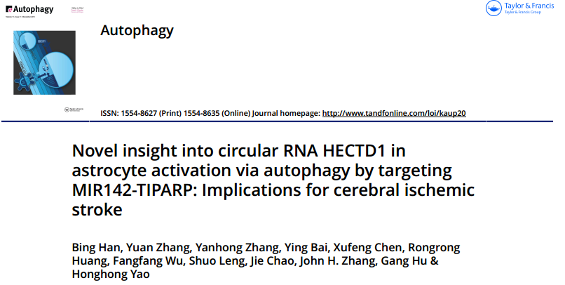 1. Han B, Zhang Y, Zhang Y, et al.. Novel insight into circular RNA HECTD1 in astrocyte activation via autophagy by targeting MIR142-TIPARP: implications for cerebral ischemic stroke. Autophagy. 2018 Jul 20:1-21. doi: 10.1080/15548627.2018.1458173.