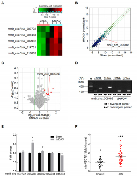 作者建立的tMCAO疾病模型中,脑皮质血流都是减少了基线水平的75%以上。circRNA芯片分析,热图揭示tMCAO疾病组中有5种circRNAs上调1.5倍以上(A);散点图(B)和火山图(C)的分析结果也展示了。接着通过体外设计引物RT-PCR验证,发现只有circRNA_008488(circHECTD1)的上调水平与芯片分析结果一致(D, E)。同时对临床急性缺血性中风病人(AIS)的血浆样本分析,也发现了circHECTD1的水平上调(F)。以上结果证明了,在局部缺血组织circHECTD1的表达水平上调。