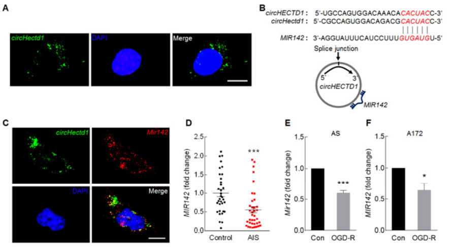 通过荧光原位杂交FISH实验证明, circHECTD1主要分布在胞浆(A),这促使作者联想circHECTD1是否会作为内源竞争性RNA,通过互补碱基配对结合miRNAs,从而影响miRNAs调控某个基因的转录表达。通过RNA杂交的生物信息系统分析,发现circHECTD1包含靶向MIR142的序列位点(B),FISH实验也证明circHECTD1与MIR142在胞浆中的共定位(C)。同时AIS病人血浆中MIR142的水平要远远低于健康人群的(D);体外经OGD-R诱导活化,胞内MIR142的表达水平明显下调(E-F);通过体外正反亲和吸附分离实验,证明biotin标记的野生型MIR142可以亲和分离circHECTD1,而不能分离阴性对照circDLGAP4;biotin标记的互补配对序列突变的MIR142无法结合分离两者(G)。biotin标记特异性circHECTD1探针可作为circHECTD1可以特异性分离MIR142,而无法分离MIR30D(H)。以上结果证明circHECTD1可以结合MIR142。