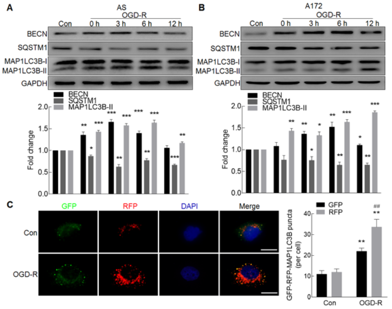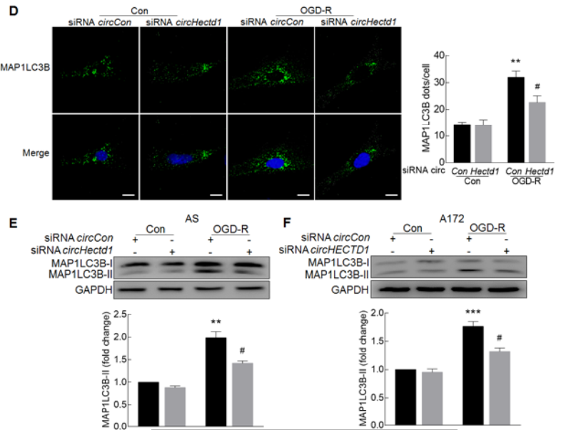 体外给予AS和A172细胞OGD-R处理后,胞内自噬相关Beclin 1和LC3B-II蛋白水平上调,p62蛋白水平下调,提示细胞内自噬流增加(A-B);通过转染胶质细胞mRFP-GFP-MAP1LC3B腺病毒,confocal成像追踪细胞活化后自噬流的变化,OGD-R处理细胞后自噬溶酶体增加,自噬流增加(C);体外敲低circHectd1表达抑制OGD-R诱导MAP1LC3BII的蛋白表达,即抑制细胞的自噬(D-F);体内敲低circHectd1表达抑制tMCAO小鼠中MAP1LC3BII的蛋白表达,以上结果证明了抑制circHECTD1的表达会抑制星型胶质细胞的活化。