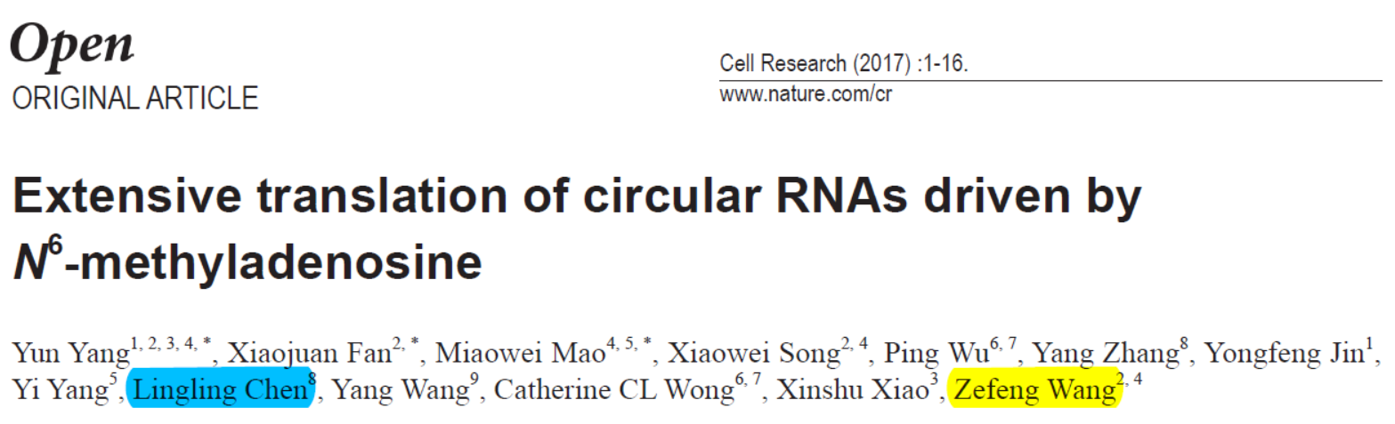 1. Yang, Y., et al., Extensive translation of circular RNAs driven by N6-methyladenosine. Cell Res, 2017.