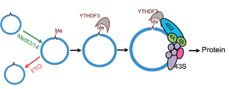 在本中王教授给出的m6A修饰调控环状RNA翻译的机制是:由METTL3/METTL14-WTAP丹巴复合物进行m6A修饰,FTO进行m6A去修饰调控。含有m6A修饰的位点通过募集YTHDF3进而募集eIF4G2,进而启动蛋白翻译过程[1]。该论文具有里程碑式的重要意义,首先证明了环状RNA可进行翻译活动,其次,还是首次报道环状RNA存在m6A修饰,填补了环状RNA化学修饰方式研究的空白。