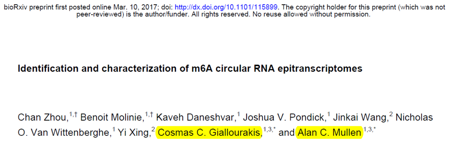 也是在3月10日,国际著名预印本杂志BioRxiv在线发表了哈佛大学医学院Cosmas C. Giallourakis和Alan C. Mullen为共同通讯作者的论文,介绍发现了环状RNA也存在m6A修饰[2]。