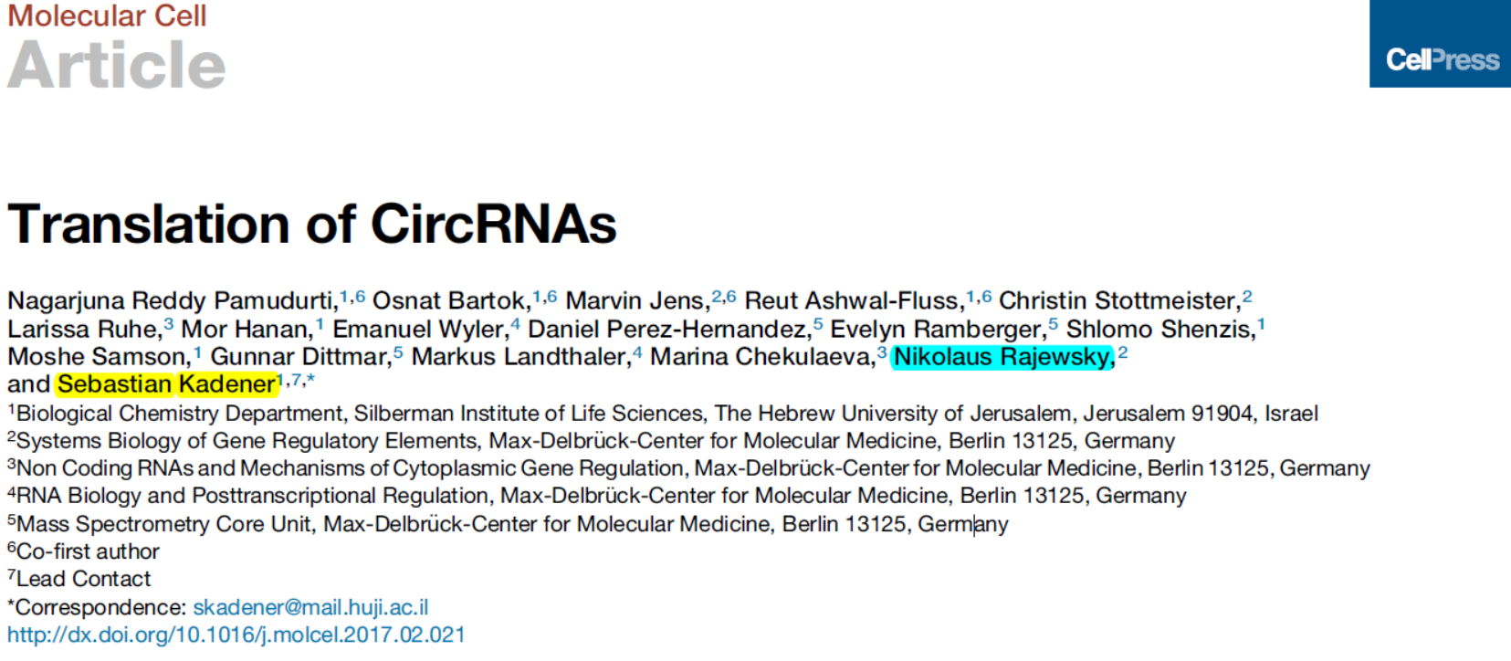 3月15日,Molecular Cell在线发表了以色列希伯来大学的Sebastian Kadener教授,介绍基于果蝇大脑中核糖体印迹分析(ribosome footprinting)发现大量的环状RNA翻译蛋白或多肽的情况[3]。