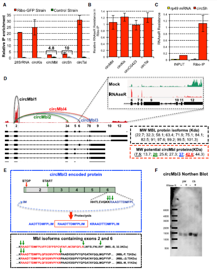 作者在果蝇的大脑组织中进行核糖体印迹分析,发现了有些环状RNA可以结合到核糖体上,于是作者认为环状RNA有可能具有翻译蛋白的功能。经过一系列的严谨实验论证,作者得出结论:部分环状RNA可翻译蛋白。核糖体印迹分析中证明circMbl中的终止密码子处有核糖体结合。circMbl所编码的蛋白在蛋白质谱中得到证据[3]。