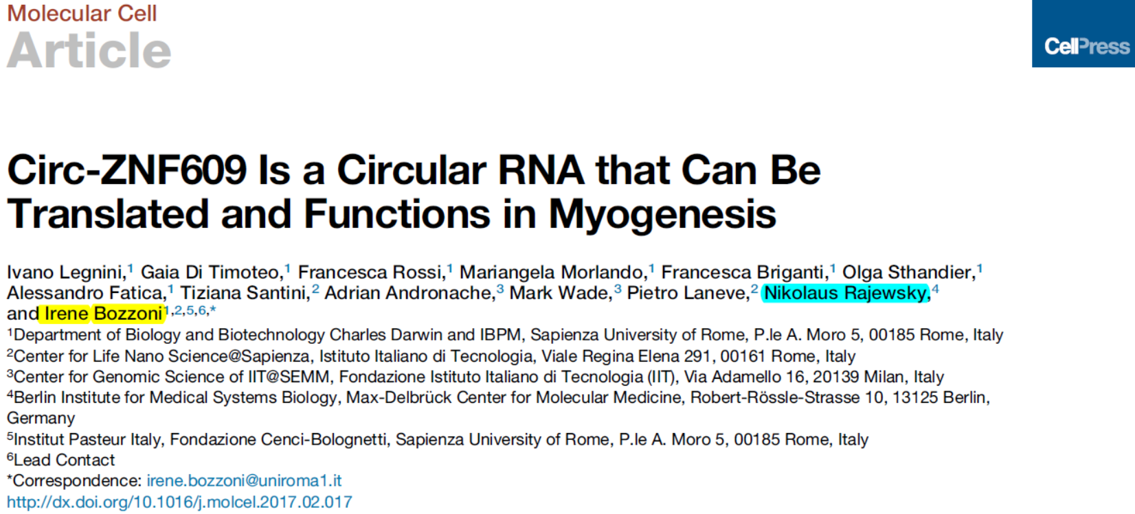 3月16日,Molecular Cell杂志在线发表了意大利罗马萨皮安扎大学Irene Bozzoni教授,介绍发现了环状RNA Circ-ZNF609可直接翻译蛋白,该蛋白参与肌肉发生过程[4]。
