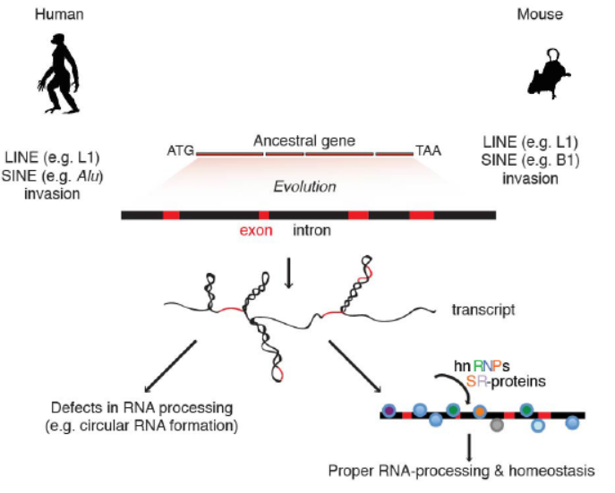 3月29日,Nature杂志在线发表了德国马普学会免疫生物学和表观遗传学研究所Asifa Akhtar教授为通讯作者的Letter文章,介绍发现反向Alu元件通过RNA解旋酶DHX9调控RNA转录后加工过程。DHX9缺失会导致环状RNA增多,为反向Alu元件调控RNA转录产物加工过程提供了全新的机制模型[5]。