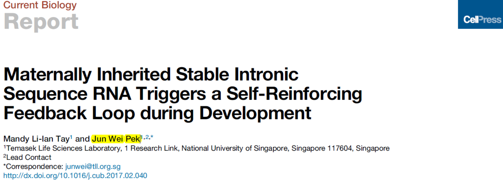 6. Tay, M.L. and J.W. Pek, Maternally Inherited Stable Intronic Sequence RNA Triggers a Self-Reinforcing Feedback Loop during Development. Curr Biol, 2017.