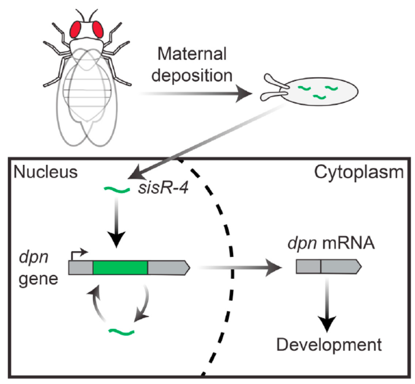 文中作者一开始希望找出果蝇发育过程中母系遗传的内含子来源的环状RNA,经过RNase R处理后测序,找到了5个环状RNA,再结合遗传特性,确定CG9775 和deadpan基因内含子来源的环状RNA符合要求。作者在本文中重点探讨了来源于deadpan基因内含子的环状RNA sisR-4在胚胎发育过程中的作用以及与宿主基因deadpan的关系。最终结果表明sisR-4可以母系遗传的方式通过提高宿主基因的表达在发育过程中发挥作用[6]。