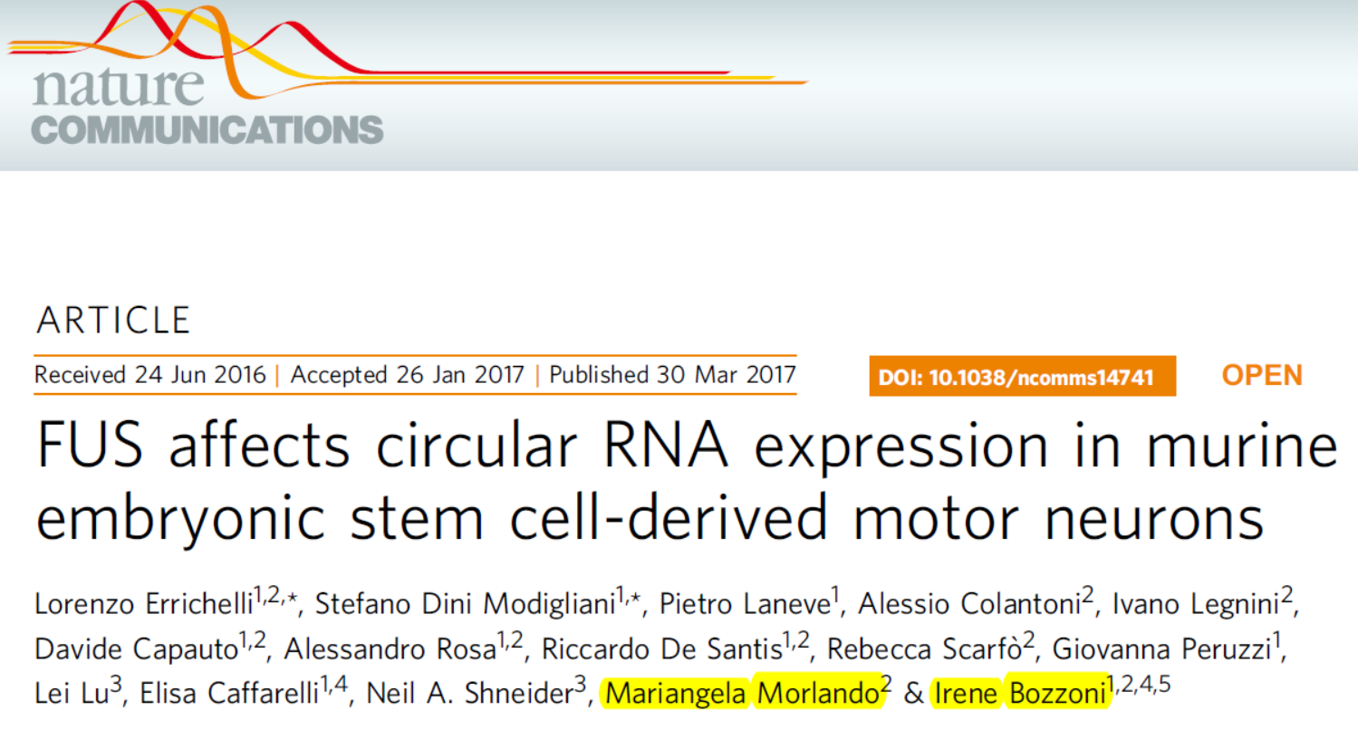 3月30日,Nature Communication杂志在线发表了罗马萨皮安扎大学Mariangela Morlando教授和意大利技术研究所Irene Bozzoni教授为共同通讯作者的文章,介绍发现RNA结合蛋白FUS在神经元中介导RNA反向拼接活动,与环状RNA的形成有关[7]。