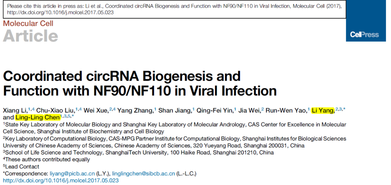 6月15日,Cell子刊Molecular Cell杂志在线发表了陈玲玲教授和杨力教授为共同通讯作者的文章,报道发现病毒感染相关因子NF90/NF110通过促进内含子互补序列稳定性促进circRNA形成。