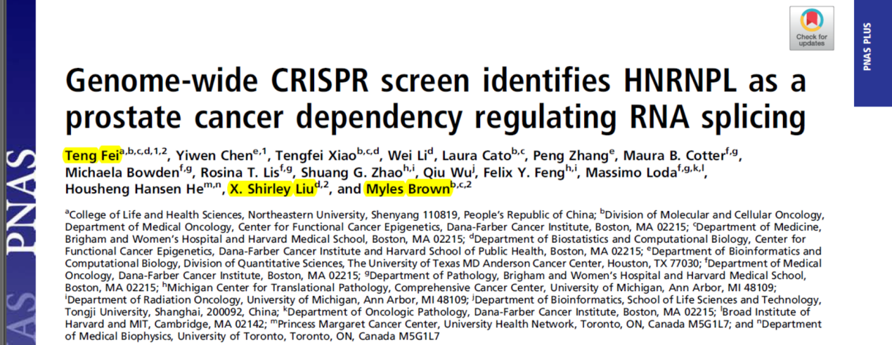 6月13日,PNAS杂志在线发表了一篇前列腺癌中筛选RNA拼接因子的文章,介绍基于CRISPR基因打靶文库筛选体系,鉴定到与前列腺癌有关的RNA拼接因子HNRNPL,该因子也参与调控了circRNA的形成过程[2]。文章的通讯作者为东北大学生命科学与健康学院“青年千人计划”费腾教授,哈佛大学公共健康学院/Dana-Farber癌症研究所X. Shirley Liu教授和Dana-Farber癌症研究所/哈佛大学医学院Myles Brown教授[2]。