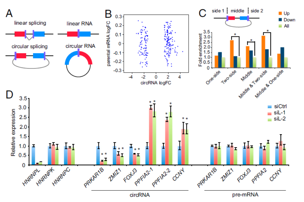 本文主要报道发现了病毒感染相关的因子NF90/NF110参与circRNA的形成过程。是通过RNA干扰文库筛选鉴定出来的,NF90/NF110通过稳定内含子互补序列结构促进circRNA的形成。病毒感染的条件下,诱导NF90/NF110出核并抑制病毒复制,circRNA生成量也随之降低[1]。