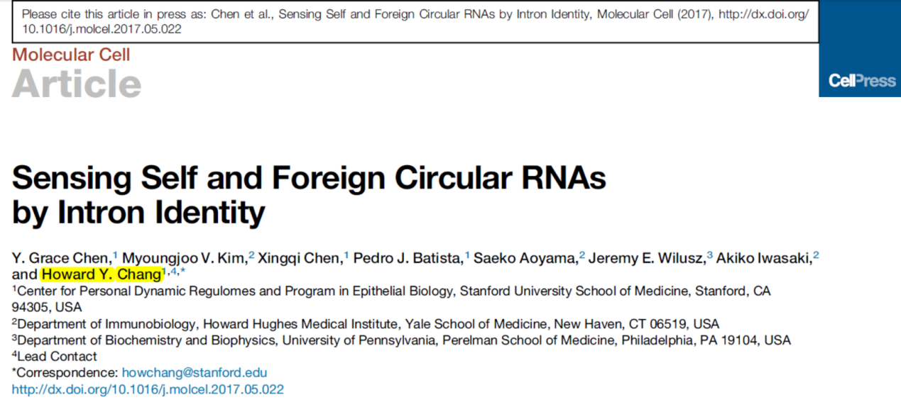 6月15日,Molecular Cell杂志在线发表了一项重要的circRNA研究成果,介绍发现了细胞识别内外源circRNA的机制[3]。文章的通讯作者是斯坦福大学医学院的Howard Y. Chang教授。