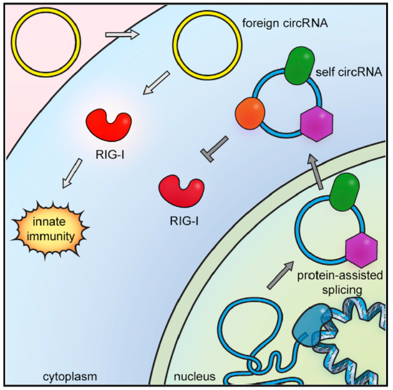 文中作者尝试基于体外转录后自动拼接环化获得circRNA,以此转染细胞,意外的发现了体外获得的circRNA会诱导细胞自身免疫效应通路的激活,并抑制RNA病毒的感染过程,该过程由RIG-I介导,内源的circRNA由于结合一些RNA结合蛋白而不会诱导该通路[3]。