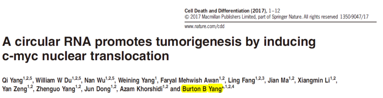 6月16日,Nature子刊 Cell Death & Differentiation在线发表了加拿大多伦多大学杨柏华教授为通讯作者的文章,介绍发现了circRNA circ-Amotl1通过诱导c-Myc入核而促进肿瘤发生[4]。就在前不久,杨教授刚刚发表了文章介绍该circRNA在创口愈合过程中发挥重要作用。