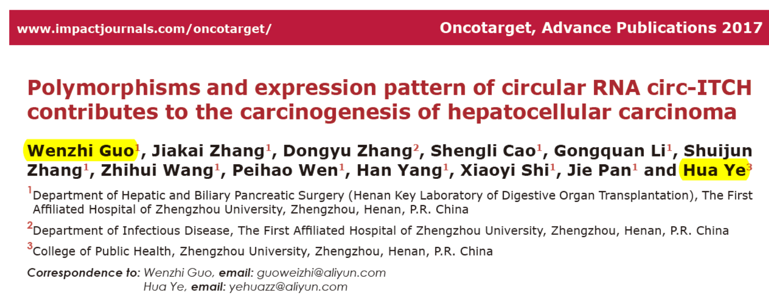 6月1日,Oncotarget杂志在线发表了郑州大学附属第一院郭文治副主任和公共卫生学院Ye Hua为共同通讯作者的文章,介绍在肝细胞癌中发现circ-ITCH多态性和表达状态与肝细胞癌的疾病相关性[5]。