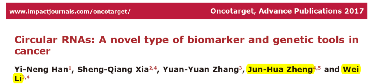 6月2日,Oncotarget杂志在线发表了同济大学附属第一人民医院郑军华教授和美国维克森林大学Li Wei为共同通讯作者的综述文章,系统回顾了circRNA作为肿瘤新型标志物的可行性和主要进展[8]。