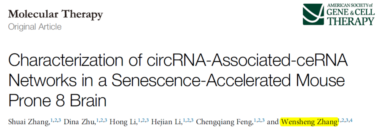 9. Shuai Zhang, D.Z., Hong Li, Hejian Li, Chengqiang Feng and Wensheng Zhang, Characterization of circRNA-Associated-ceRNA Networks in a Senescence-Accelerated Mouse Prone 8 Brain. Molecular Therapy, 2017.