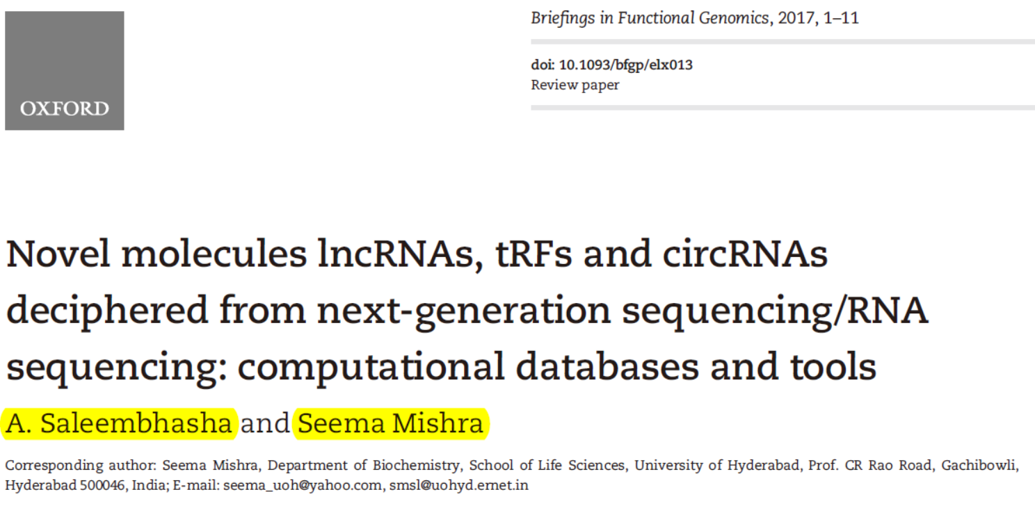 11. Saleembhasha, A. and S. Mishra, Novel molecules lncRNAs, tRFs and circRNAs deciphered from next-generation sequencing/RNA sequencing: computational databases and tools. Brief Funct Genomics, 2017.