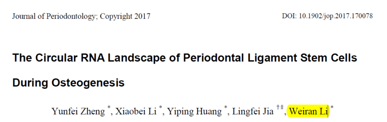 6月9日,Journal of Periodontology在线发表了北京大学口腔医学院李巍然教授为通讯作者的文章,介绍他们分析的牙周膜干细胞在造骨期间的circRNA变化情况的研究工作[12]。