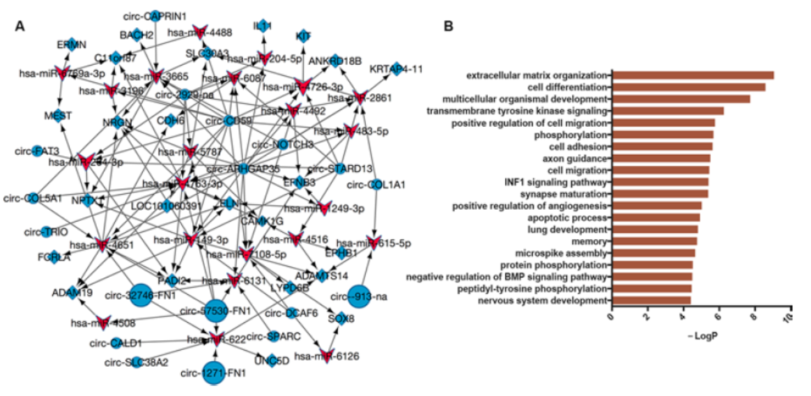 本文作者在7月龄的SAMP8的AD小鼠模型的脑组织中分析了circRNA的变化情况,找到了235种明显变化的circRNA,借助信息学工具构建了ceRNA网络[9]。