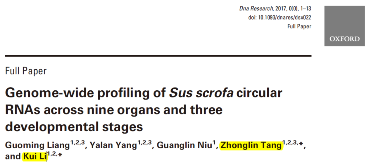 5月29日,DNA Research杂志在线发表了中国农业科学院北京畜牧兽医研究所唐中林研究员和李奎教授为共同通讯作者的文章,介绍在贵州小型猪不同发育阶段circRNA变化情况[14]。