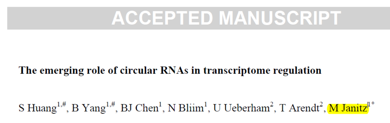 6月24日,Genomics杂志在线发表了澳大利亚新南威尔士大学M Janitz教授作为通讯作者的综述文章,汇总分析了circRNA在转录调控中的作用机制研究进展[15]。
