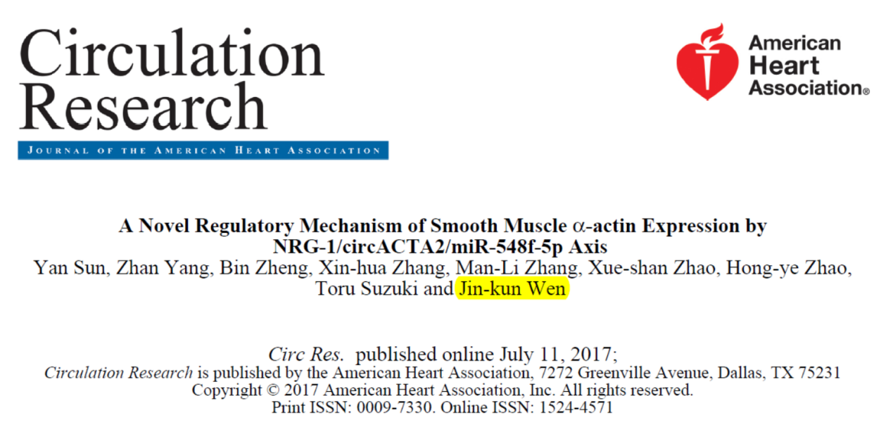 7月11日,知名杂志Circulation Research在线发表了河北医科大学温进坤教授为通讯作者的文章,介绍发现血管平滑肌细胞中调控α-actin基因表达的通路,其中circRNA circACTA2发挥重要作用[1]。