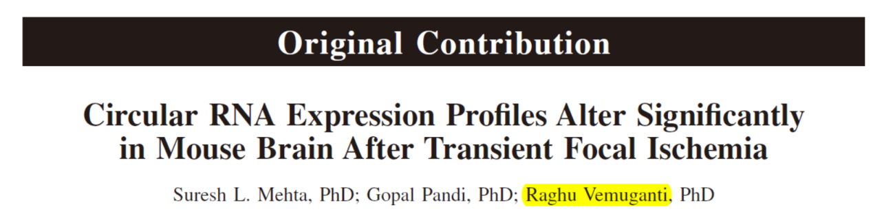 2. Mehta, S.L., G. Pandi, and R. Vemuganti, Circular RNA Expression Profiles Alter Significantly in Mouse Brain After Transient Focal Ischemia. Stroke, 2017.