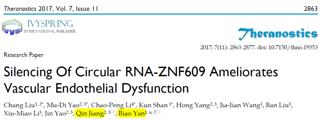 3. Chang Liu, M.-D.Y., Chao-Peng Li, Kun Shan, Hong Yang, Jia-Jian Wang, Ban Liu, Xiu-Miao Li, Jin Yao, Qin Jiang and Biao Yan, Silencing Of Circular RNA-ZNF609 Ameliorates Vascular Endothelial Dysfunction. Theranostics, 2017. 7(11): p. 2863-2877.