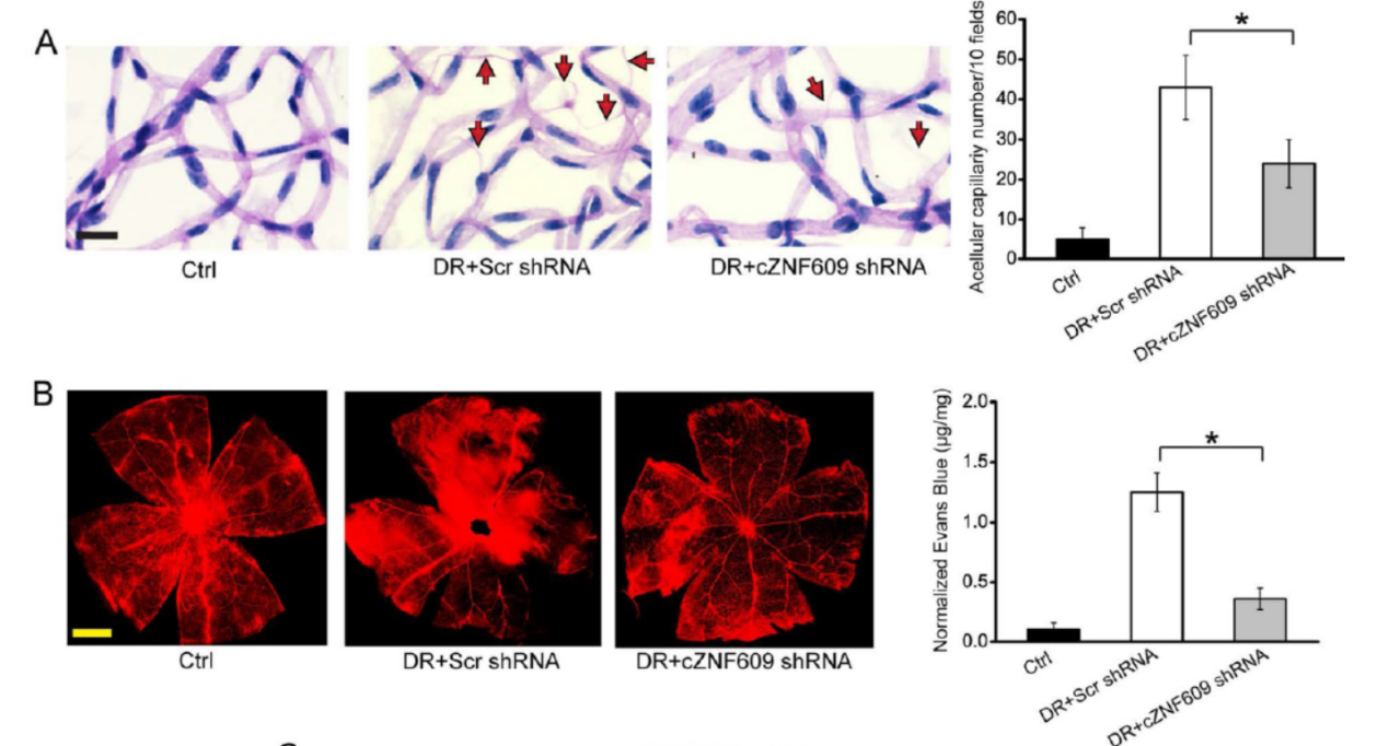 血管功能障碍与癌症等多种疾病有关,本文作者发现敲低circRNA-ZNF609可改善血管内皮细胞的功能障碍。在体内模型中,敲低circRNA-ZNF609可降低视网膜血管减少并抑制病理性血管异常。体外实验也表明敲低circRNA-ZNF609可促进血管内皮细胞的功能。机制方面作者发现circRNA-ZNF609可竞争性结合miR-615-5p[3]。