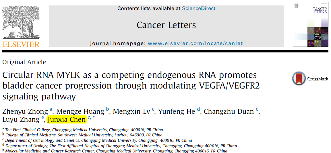 7月4日,Cancer Letters杂志在线发表了重庆医科大学陈俊霞教授为通讯作者的研究论文,介绍发现circRNA MYLK作为ceRNA通过调节VEGFA/VEGFR2信号通路促进膀胱癌发生发展[4]。文章通过严谨的实验有力地论证了circRNA MYLK作为ceRNA通过调节VEGFA/VEGFR2通路促进BC的发生发展,是一篇难得的miRNA sponge功能模型的文章。