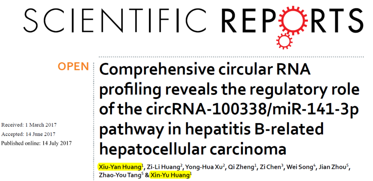 7月14日,Nature子刊 Scientific Reports在线发表了上海交通大学附属第六人民医院Huang Xiu-Yan和Huang Xin-Yu为共同通讯作者的文章,介绍发现circRNA-100338 /miR-141-3p通路在乙肝相关肝细胞癌中的作用[5]。