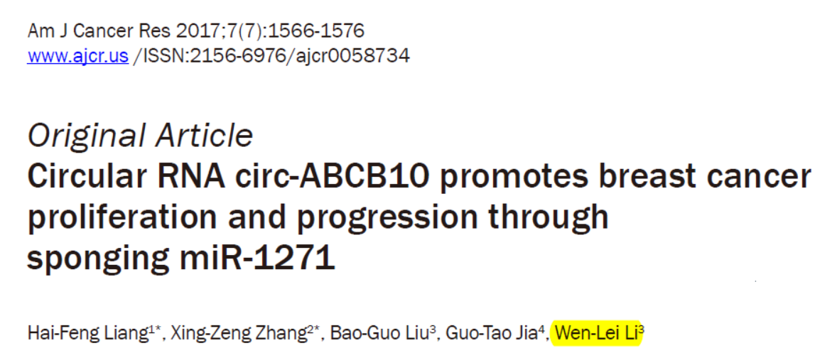 7月15日,American Journal of Cancer Research在线发表了聊城人民医院李文磊为通讯作者的文章,介绍发现circ-ABCB10通过竞争性结合miR-1271促进乳腺癌增殖[7]。